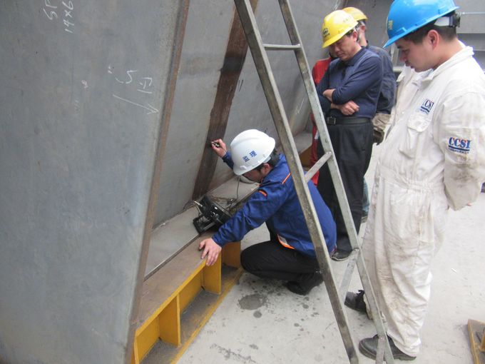 2015年3月31日,寧波市交通建設(shè)工程試驗(yàn)檢測(cè)中心有限公司一行3人組成檢測(cè)組,前往位于江蘇省南通市如皋市的中國中鐵山橋重工集團(tuán)有限公司,對(duì)在山橋公司生產(chǎn)的寧波梅山春曉大橋鋼桁架拱橋進(jìn)行廠內(nèi)抽檢。檢測(cè)組隨機(jī)抽取了已經(jīng)過自檢合格的焊縫進(jìn)行超聲波無損檢測(cè)和X射線檢測(cè)(其中超聲波檢測(cè)25m,X射線拍片6張),并查看了第三方相關(guān)資料。檢測(cè)組與現(xiàn)場人員充分討論,并根據(jù)廠內(nèi)焊接實(shí)際,大家一致認(rèn)為自檢和第三方檢測(cè)對(duì)鋼結(jié)構(gòu)非常重要,及時(shí)避免了不合格產(chǎn)品的出廠。